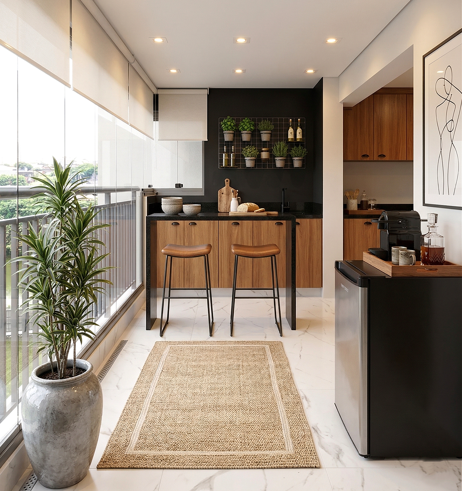 Ilha central em quartzo com marcenaria em tons amadeirados.
